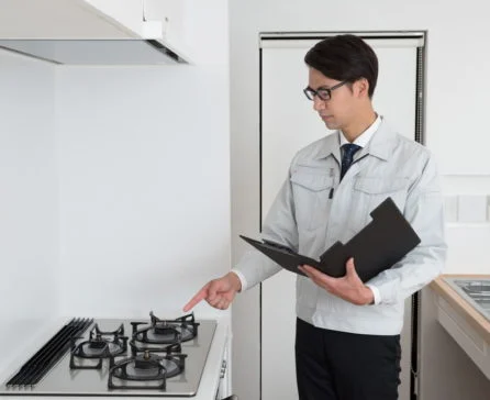 点検では、ガス設備周辺にガス漏れがないか、ガスコンロやガス給湯器の燃焼は適切か確認します。