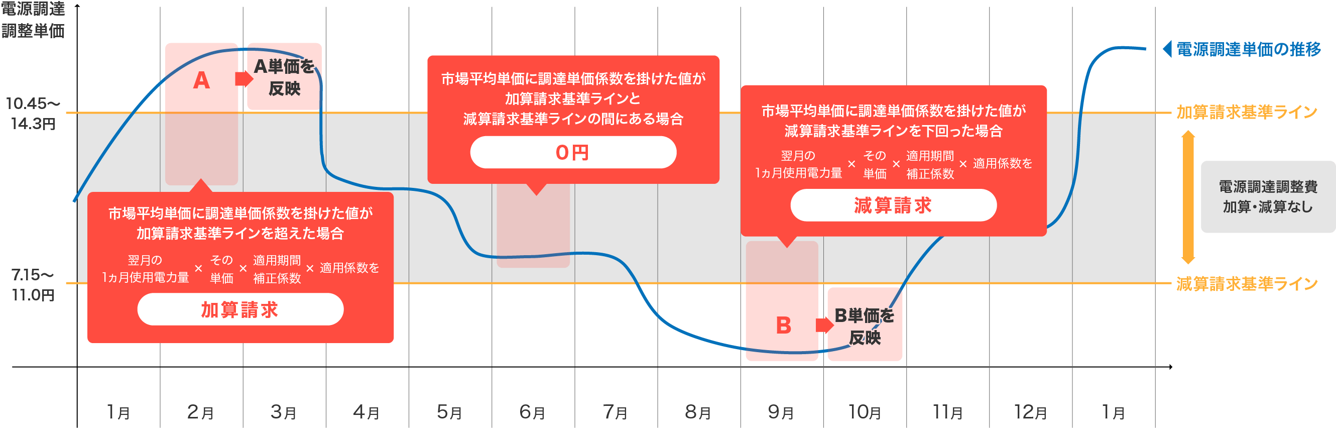 電源調達調整費とは … 従来の燃料費調整額に加え、当社の電力調達にかかる実際の費用(調達調整費)に応じて算出されます。