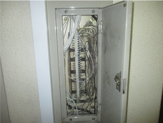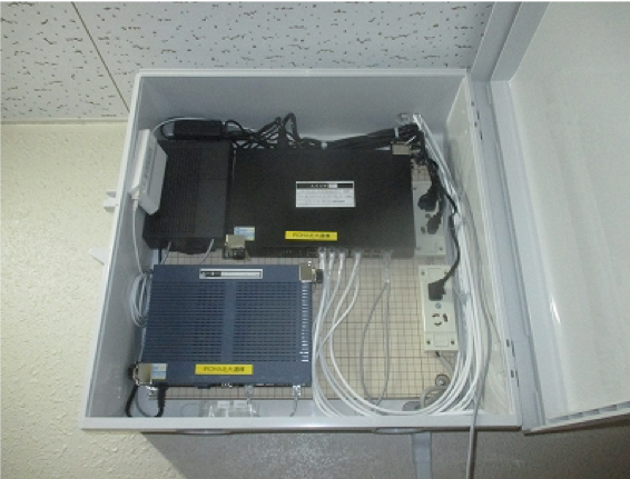 建物共用廊下の上部に、新しく当社サービス用の機器収納ボックスを設置。 機器収納ボックス内には、ONU、ルーター、HUBを設置。 電源の引き込み工事も全て当社で行います。
