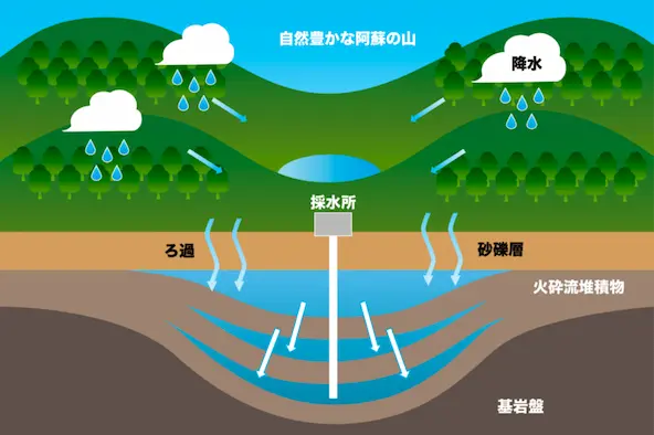 南阿蘇のブナの森に降った雨は、地表を覆う厚いブナの葉土に貯えられ、長い年月をかけて地下に浸透。そして、南阿蘇の大自然が育む森林土壌のフィルターにより不純物が取り除かれ、自然ろ過された清らかな天然水です。