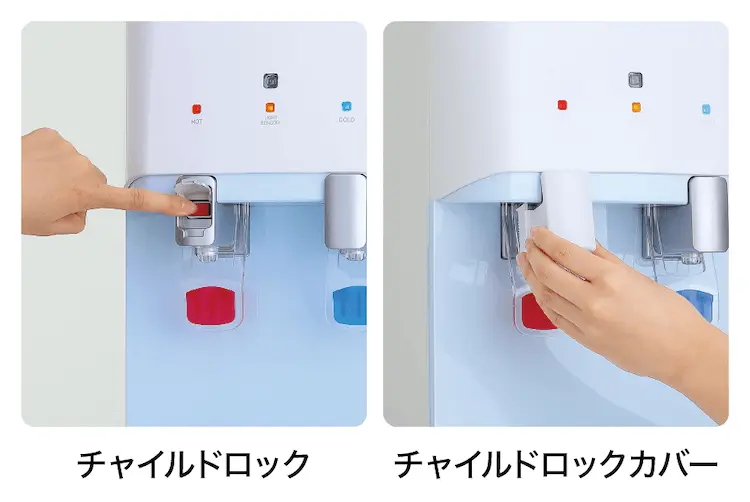 出水レバーとロックボタンの両方の操作が必要な「チャイルドロック」と
